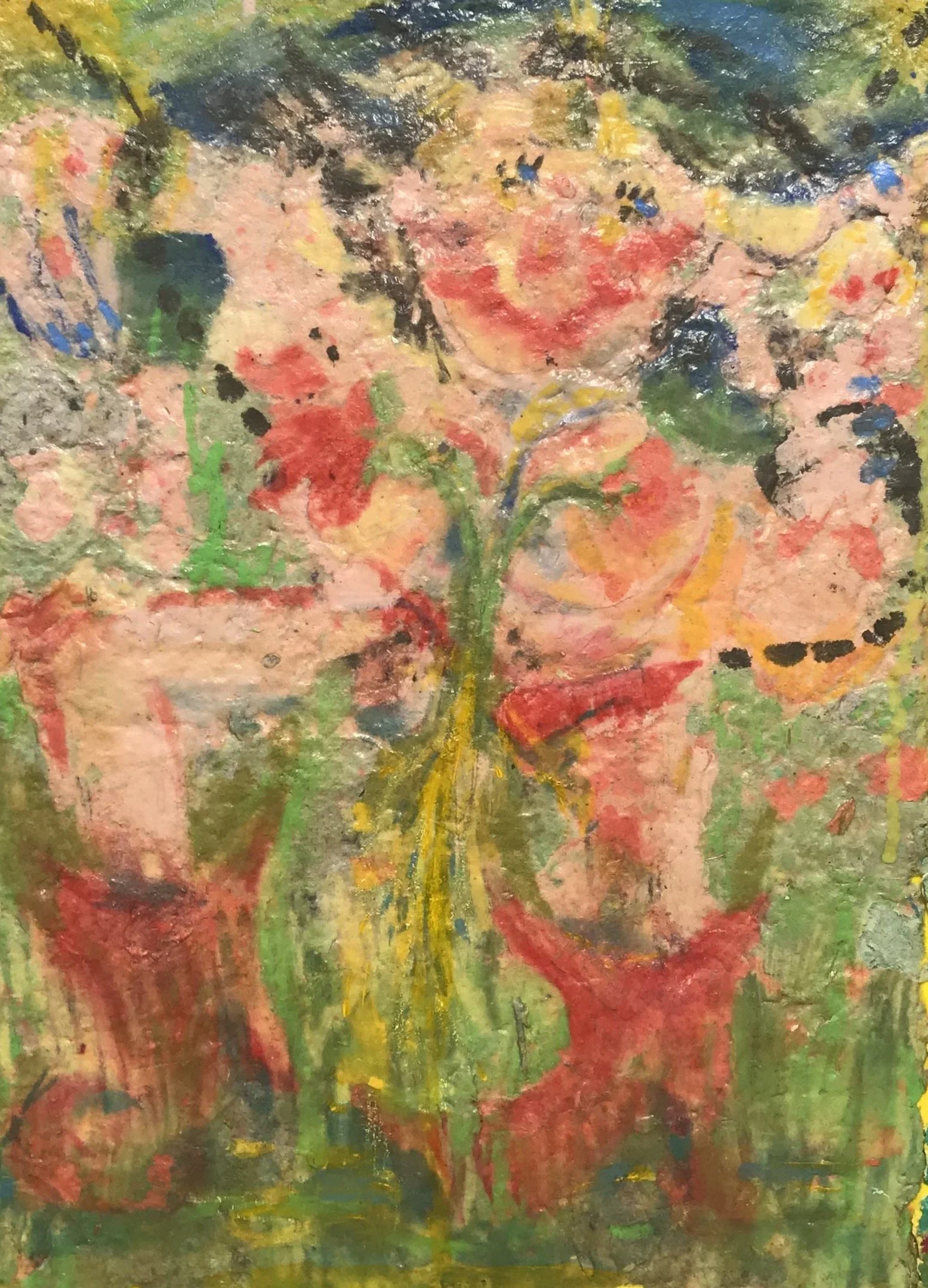 Acrylic paint, Caran d’ Ache crayon, pencil, paper pulp, oil pastel