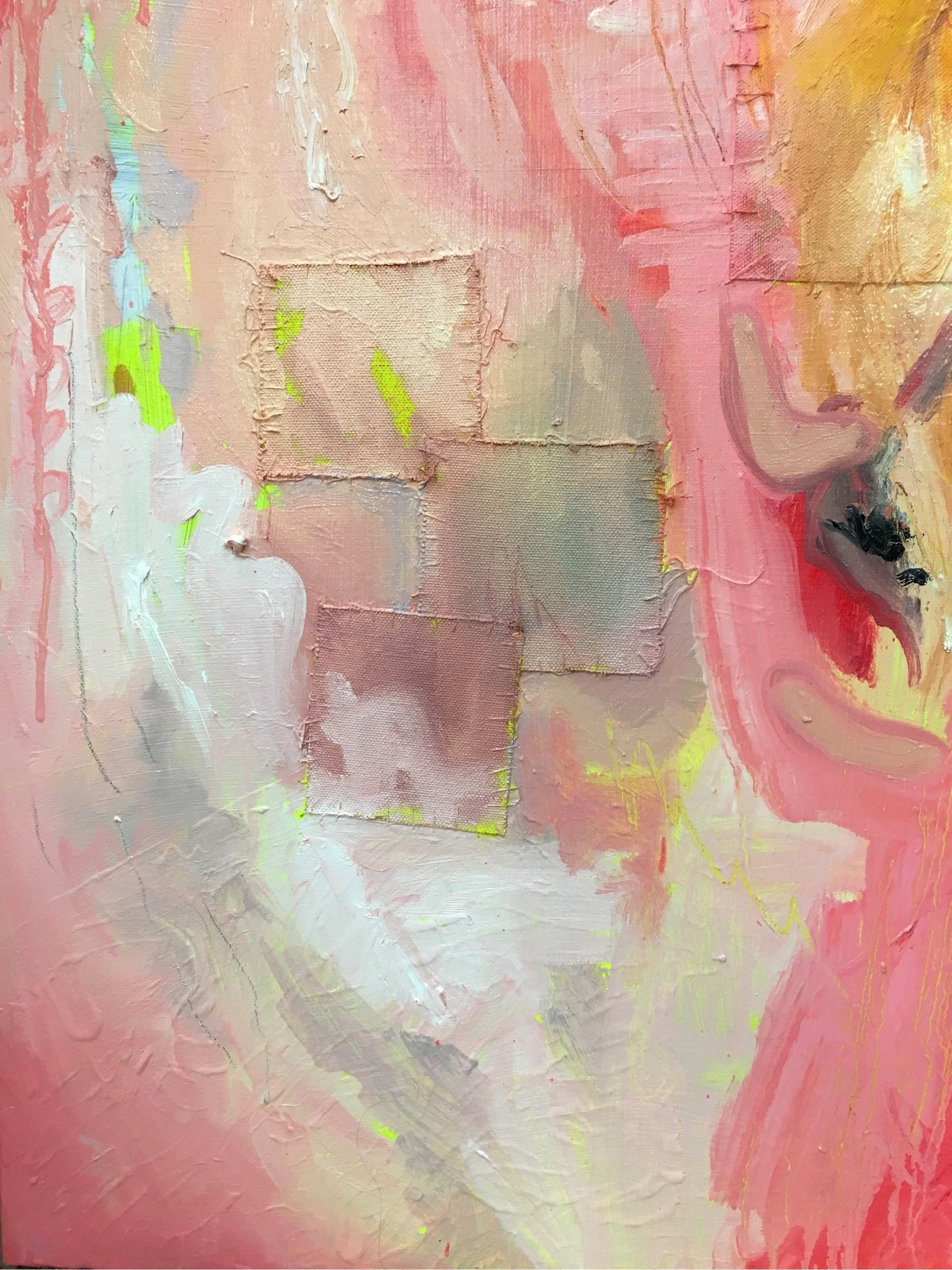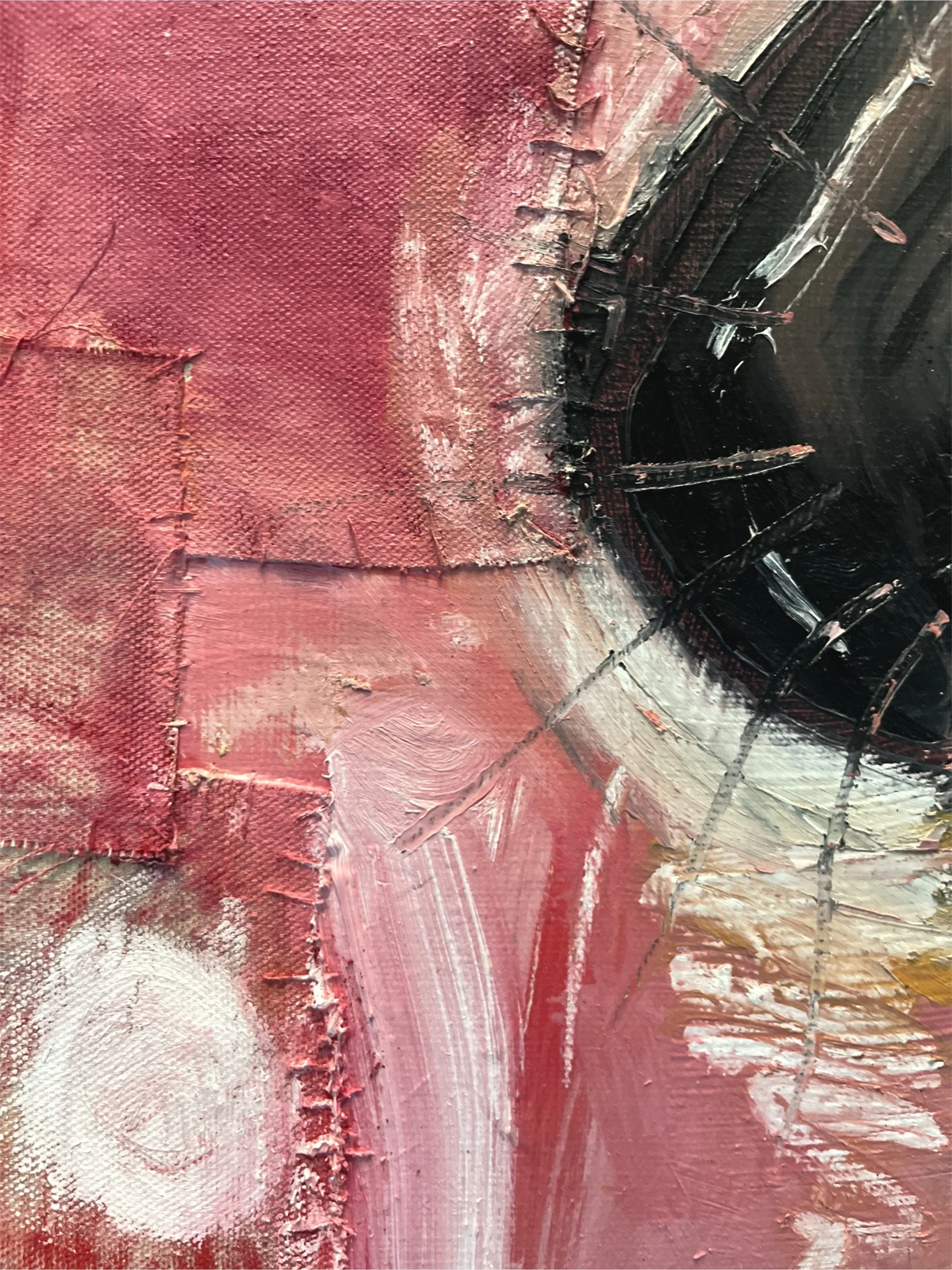 Oils, acrylics, oil pastel, pencil, hand-sew canvas